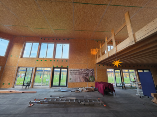 Der gesamte Bau entsteht in moderner Holzbauweise – nachhaltig, warm und ökologisch sinnvoll. Innen wird die hochwertige Holzkonstruktion besonders sichtbar: Wände, Decken und Tragwerk verleihen dem Gebäude eine helle, natürliche Atmosphäre.