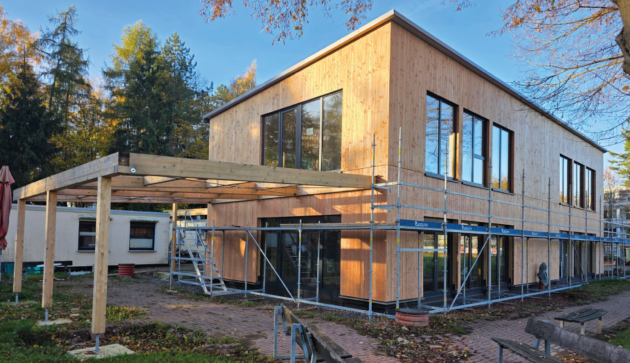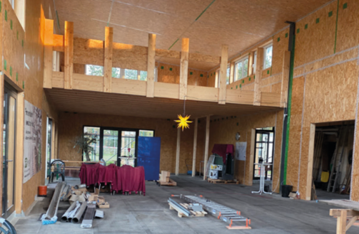 Der gesamte Bau entsteht in moderner Holzbauweise – nachhaltig, warm und ökologisch sinnvoll. Innen wird die hochwertige Holzkonstruktion besonders sichtbar: Wände, Decken und Tragwerk verleihen dem Gebäude eine helle, natürliche Atmosphäre.